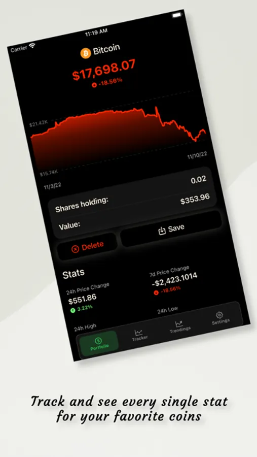 - Add coins to your Personal Portfolio and keep track of them with nice graphs.