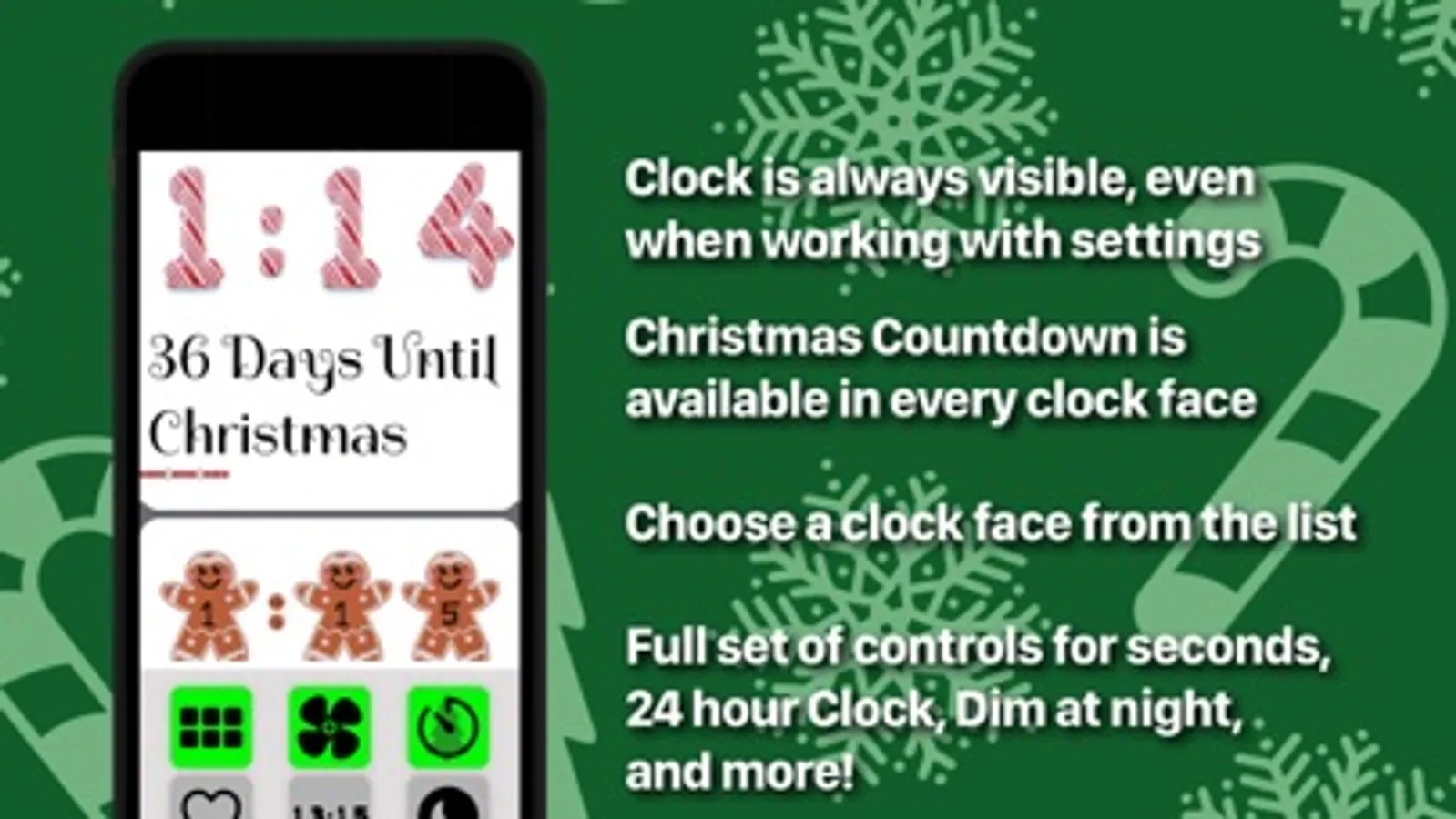 Display the time with full screen clock faces designed by independent artists for The Holidays. Numbers made from Candy, Cookies, Gnomes and other Christmas favorites have all been designed with kids in mind and are sure to put a smile on anyone's face during the busy season!