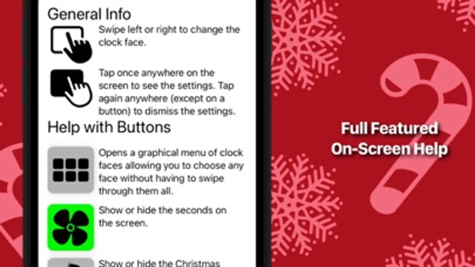Swipe left or right to change the clock face, or tap the screen for more in-depth settings that include choosing from a list of clocks, showing seconds crawlers designed to match each face, activating the Christmas Countdown text, 12 or 24 hour formats, and telling the clock to dim itself at night - which is especially handy when you want to leave the clock running in the dark while you watch the latest Christmas movie. A full set of helpful directions is also available by tapping on the help button.