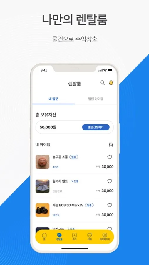 집에서 놀고있는 물건들을 통해 수익을 창출해 보는건 어떤가요? 자리만 차지하는 물건들을 빌려줌으로 어플내에서 수익을 창출해보세요! 나만의 렌탈룸을 통해 돈이 들어오고 출금을 할 수 있답니다!