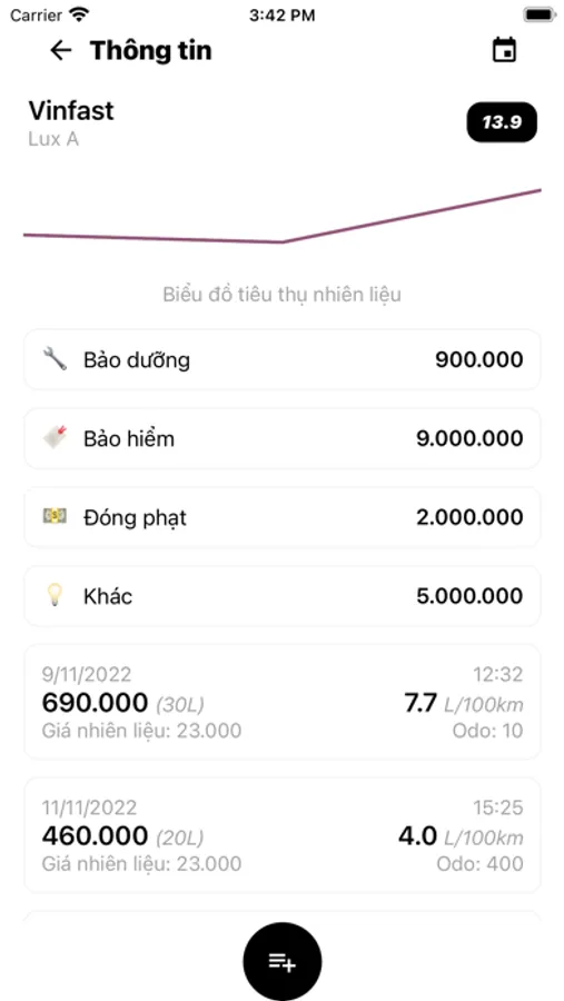 Lizo ghi lại và tổng hợp chi phí về nhiên liệu và thể hiện cụ thể hoá dưới dạng biểu đồ giúp bạn dễ dàng nắm bắt về sự thay đổi chi phí sử dụng.