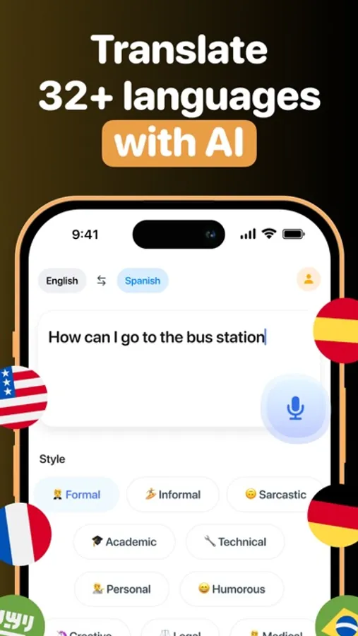 AI Translator, your ultimate translation app that turns your phone into a powerful AI translation device. With AI technology, you can effortlessly make natural translations in multiple languages such as English, Spanish, French, Arabic, Chinese and much more, simply by entering the text you want to translate and selecting the style and emotions you want to convey.