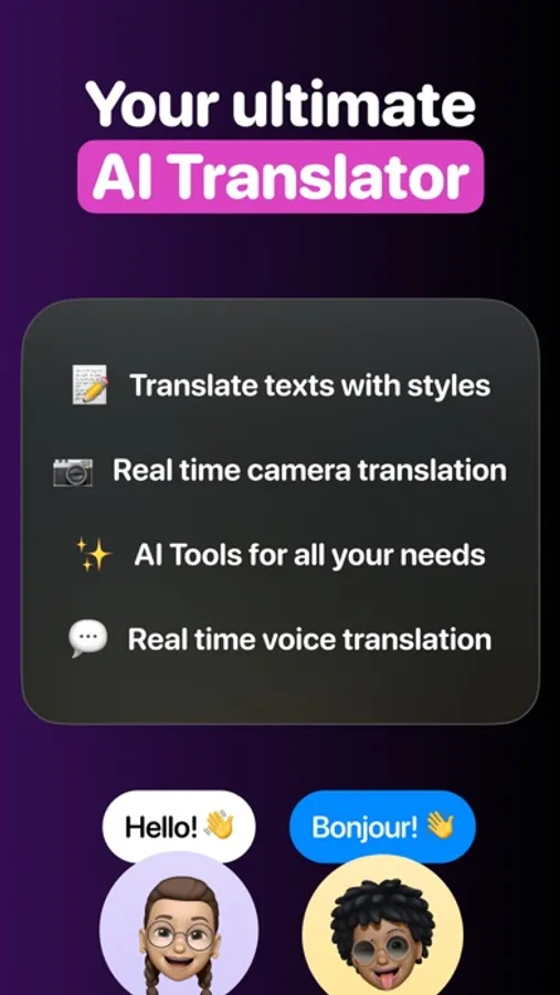 AI Translator includes text, voice, conversation and real-time camera translation as well as 25+ AI tools for all your needs in different categories and becomes your ultimate AI pocket translation assistant.