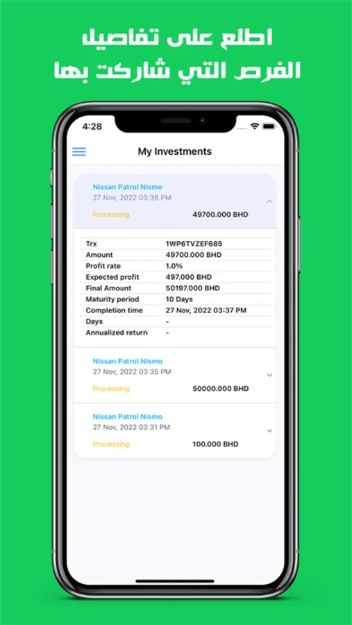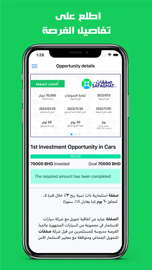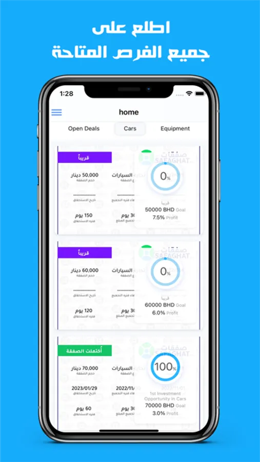 Safaghat is a crowdfunding institution authorized by the Central Bank of Bahrain, providing the best safe investment opportunities with great ease and attractive investment returns. Safaghat works with many partners with long experience and an excellent reputation in all investment fields. Safaghat provides deals with all its investment services to individuals and companies.
