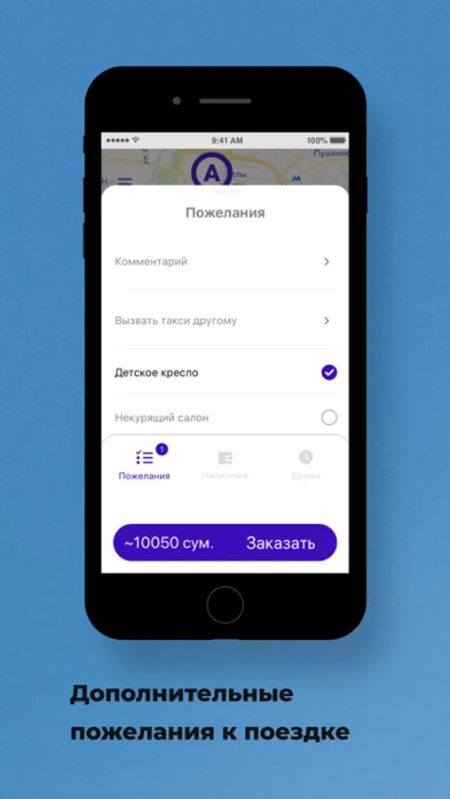 Добавьте к заказу дополнительные пожелания. Например, когда на улице +35 — выберите "кондиционер". Если вы не переносите запах табака — укажите "Некурящий салон", и к вам приедет некурящий водитель.
