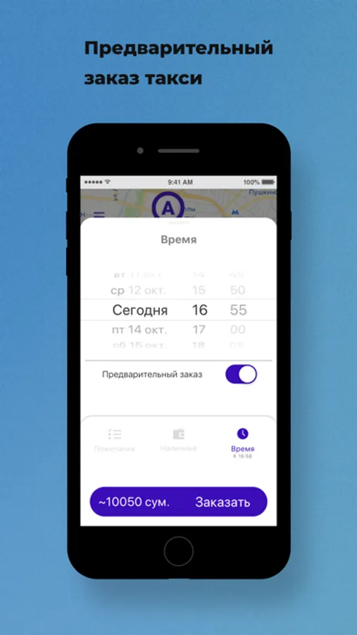 Выберите опцию “Предварительный заказ”. Поиск автомобиля начнется незадолго до заказа поездки, и автомобиль приедет к назначенному времени. Также вы будете заранее знать стоимость поездки.