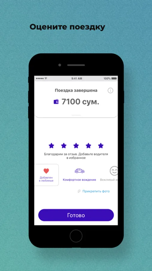 Поставьте оценку водителю, напишите отзыв или выберите реакцию из готовых шаблонов. Прикрепите фотографию к отзыву, оставьте чаевые или посмотрите детализацию платежей после поездки.