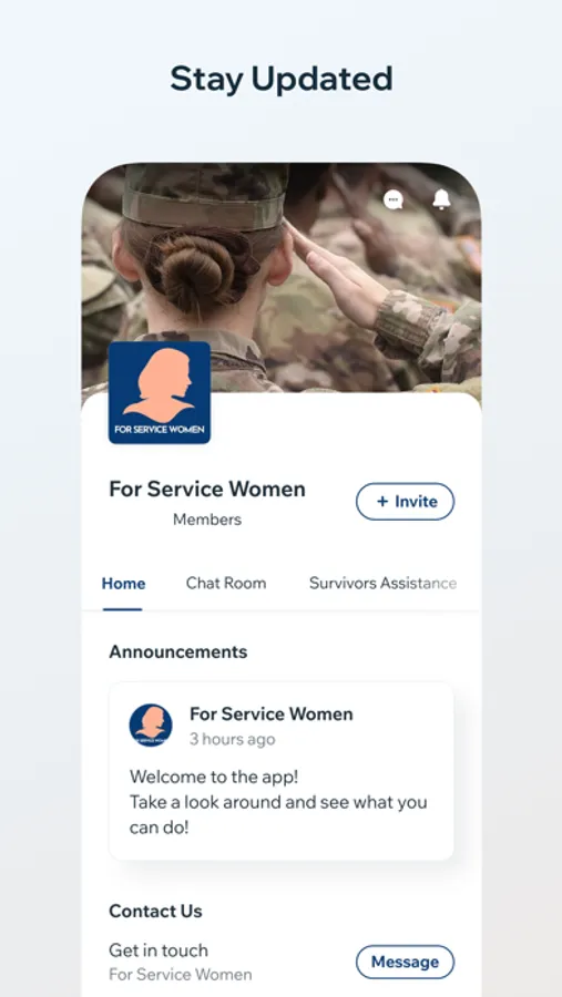 The For Service Women App is an application that provides resources, tips, and a safe community for servicewomen to talk and and build community. The For Service Women app gives military women that may be facing hardship access to support, self-care tools and information to help manage the short- and long-term effects of sexual violence, sexual assault and other life-changing experiences.