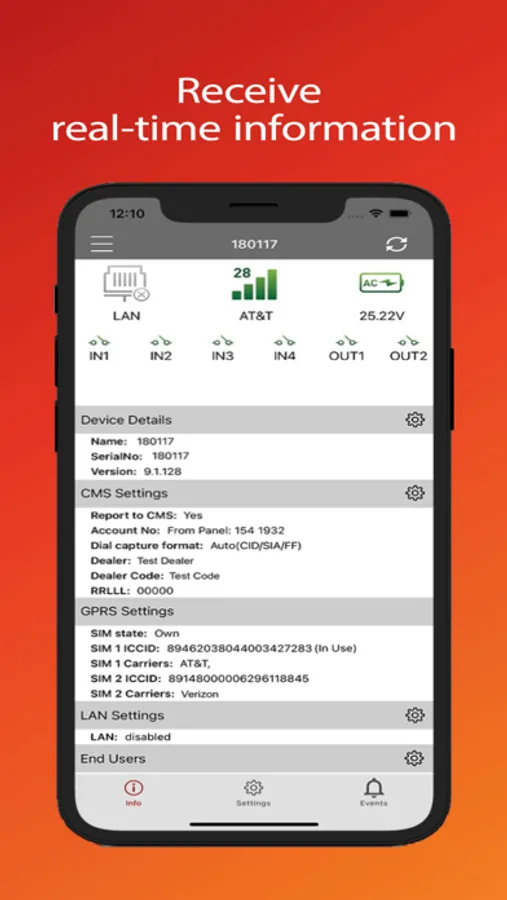 • Receive real-time information about the device cellular signal level, mobile operator, input voltage, status of the inputs and many more