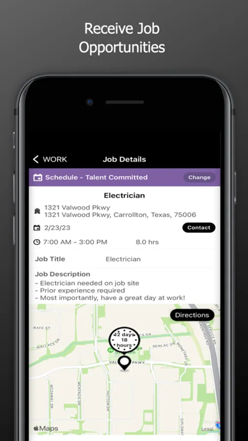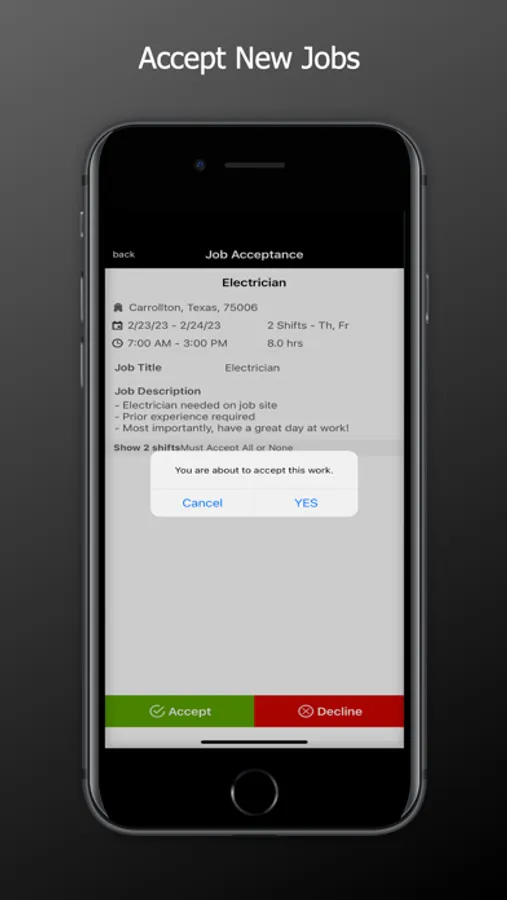 - Accept jobs and view worksite details such as address, directions, start and end time, contact info and job descriptions.