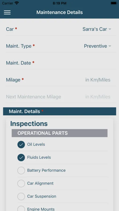 “Add New Maintenance” – Add, edit, or delete every maintenance of your vehicle including its date, type, milage, and all details of that maintenance.