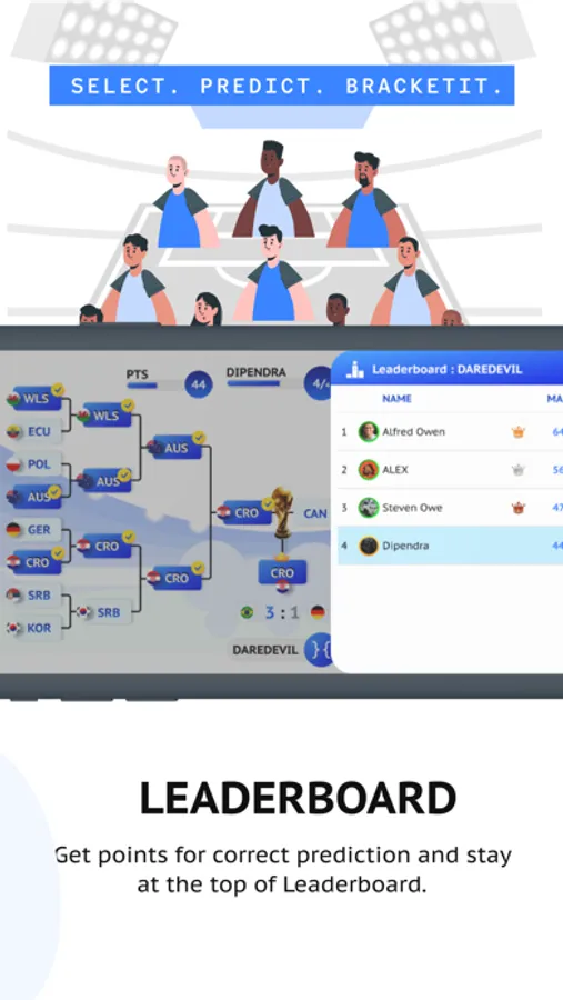 BracketIT is a mobile application designed to allow several users to come on board and share their excitement and passion for FIFA World Cup. The idea behind it is for you to make brackets, share them with your friends, and compete in them so that everyone may enjoy the sport. You can predict and compare the scores through leaderboard to make it exciting for all users.