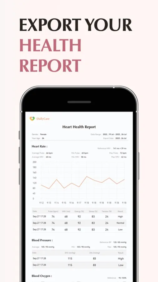 With DailyCare you can measure your heart rate anywhere with iPhone, track your health, and export your PDF Report.