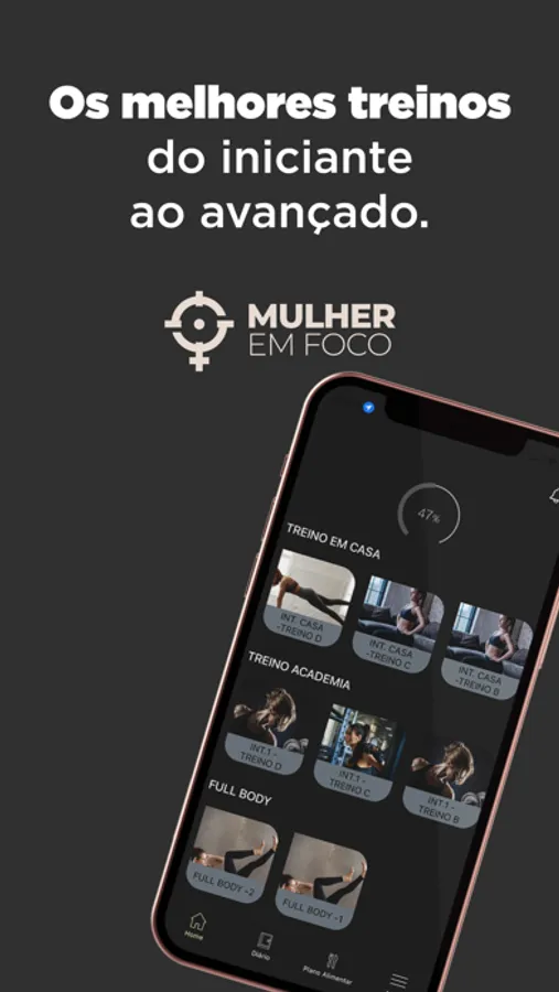 Dentro da plataforma, temos treinos para fazer em casa e na academia, desde o iniciante até o avançado pró.