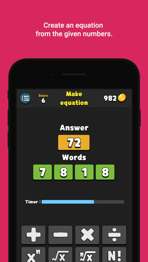 Make Equation is a game where numbers obtained from a random 5-digit or 4-digit problem are used to perform arithmetic operations such as addition, subtraction, multiplication, division, exponentiation, root, factorial, sum, total product. in order to meet the answers obtained from random It is a practice of fast arithmetic that uses many skills. There is also an arts and crafts competition every year. Let's do a speed test.