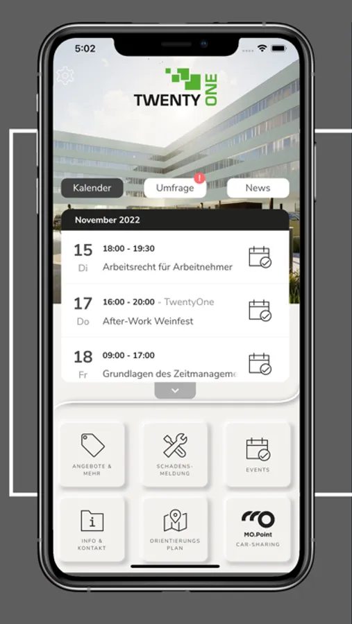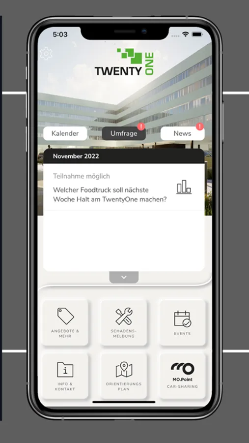 Die TwentyOne App informiert Sie über alle relevanten Neuigkeiten zum Standort sowie zu den ansässigen Unternehmen. Werden Sie Teil der TwentyOne Community und erhalten Sie aktuelle Informationen zum Baustellenfortschritt, zu spannenden Events sowie zu zahlreichen Goodies, Gutscheinen und Aktionen.