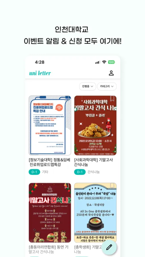 * 동아리/소모임, 학생회, 간식나눔, 대회/공모전, 스터디, 구인 등, 이제는 유니레터에서!