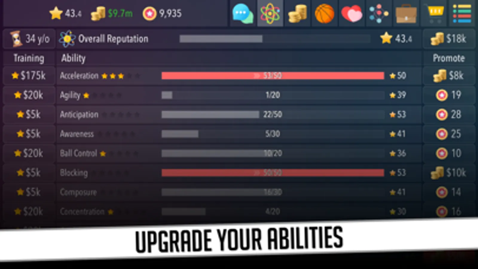 Gain experience to upgrade abilities that suit your playing style. Perhaps you focus on offensive skills to become the leading scorer or maybe concentrate on defensive duties and become a defensive powerhouse?