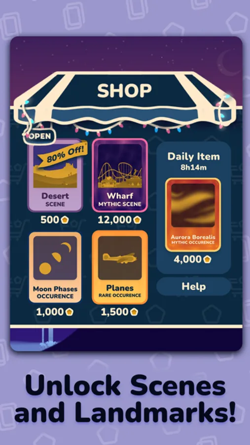 Travel across various Scenes, levelling them up to unlock special and exclusive Landmarks, like an Oasis in the Desert scene, or a Ferris Wheel along the Wharf. The better you play the game, the more Gems you can earn to spend on even more sights to see, like the Aurora Borealis or a firework display! Catch the early morning fog, or unlock birds that return home to roost at sunset. The more you play, the more you're rewarded.