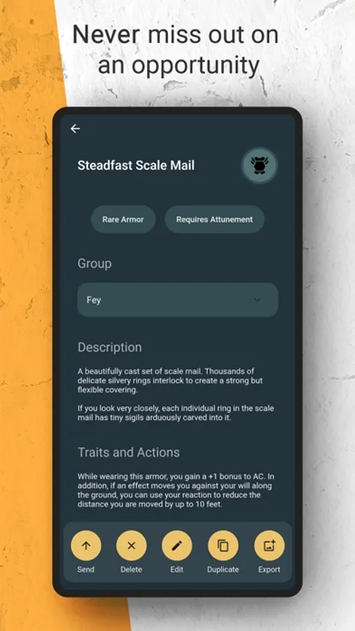 D&D Homebrew Items helps you keep track of magical items in your D&D campaigns. Think of it as a bag of holding for all the magical loot you pick up through the campaign. Never again miss an opportunity in the heat of battle because you forgot about that one clutch item.