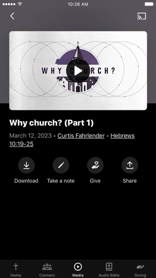 This app will help you stay connected with the day-to-day life of our church. With this app you can: watch or listen to past messages; stay up to date with push notifications; share your favorite messages via Twitter, Facebook, or email; and download messages for offline listening.