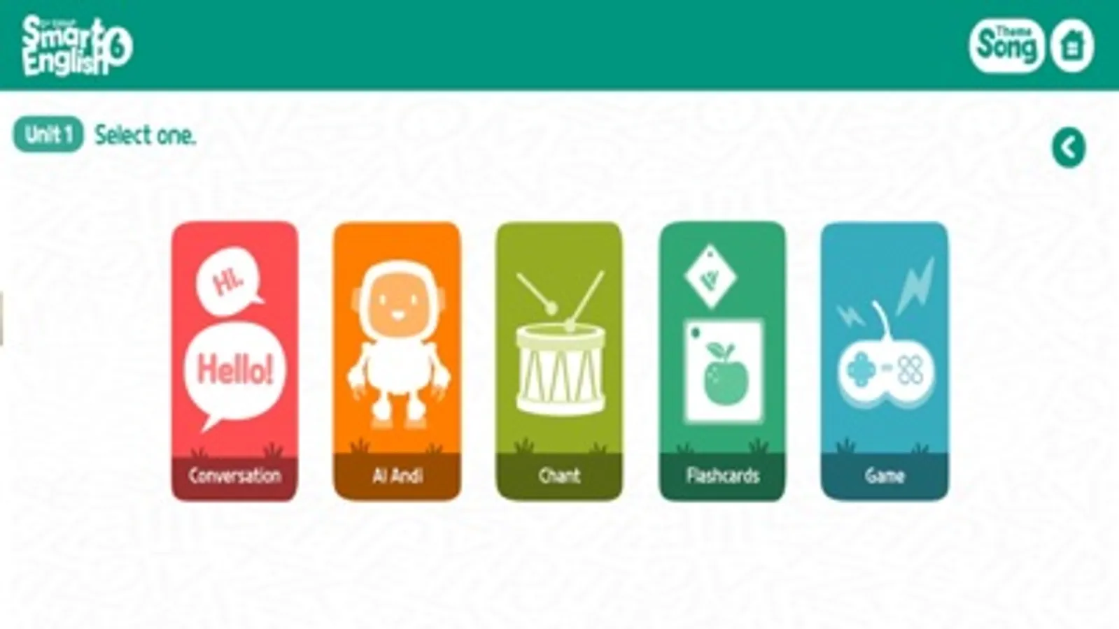 The Smart English AI Speaking App contains the series audio, animations, games, and flashcards, as well as AI Andi, your new friend. AI Andi, an adorable robot, assesses students’ pronunciation, accuracy, and fluency while they practice conversation with Smart English characters.