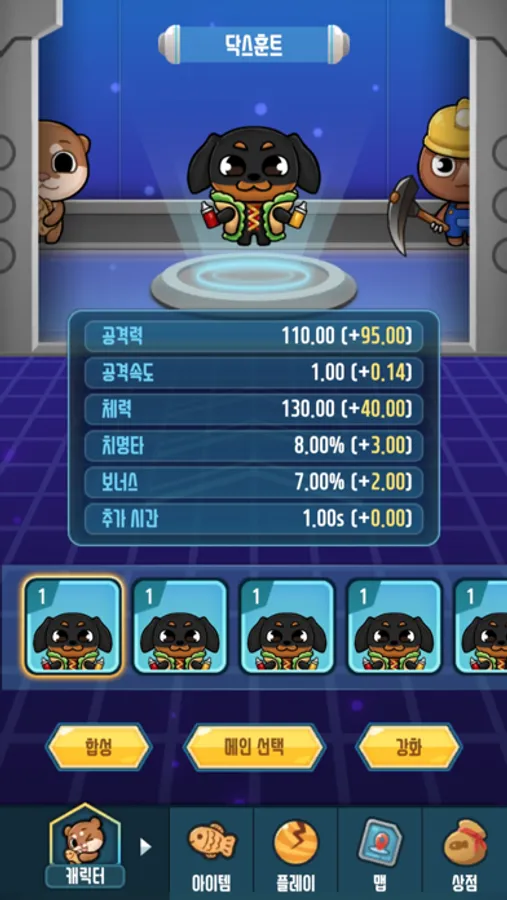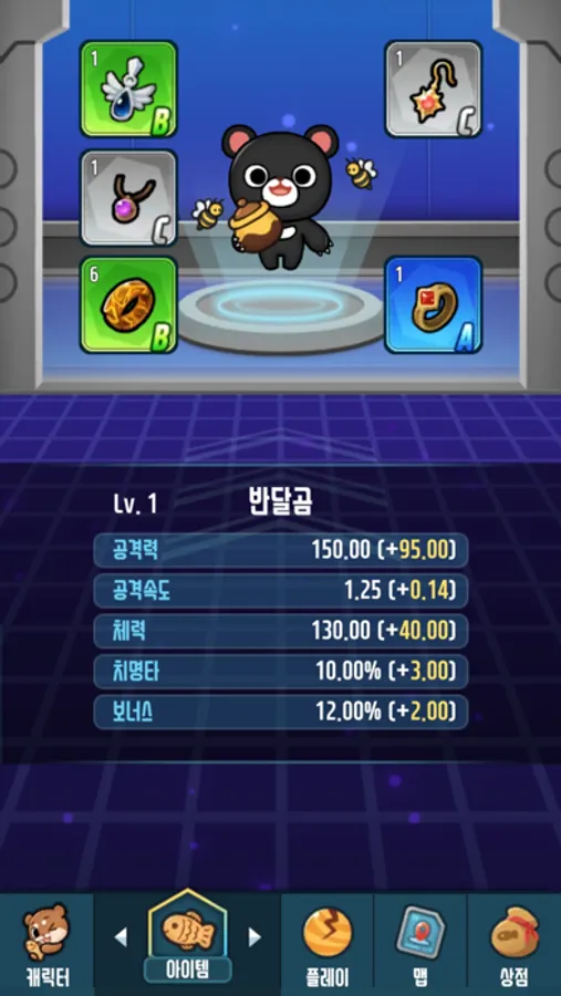아이템을 장착하고 캐릭터를 강화해서 높은 점수와 어려운 스테이지를 클리어 해보세요. 모든 아이템을 장착하면 각 캐릭터들의 필살기를 볼 수 있어요.