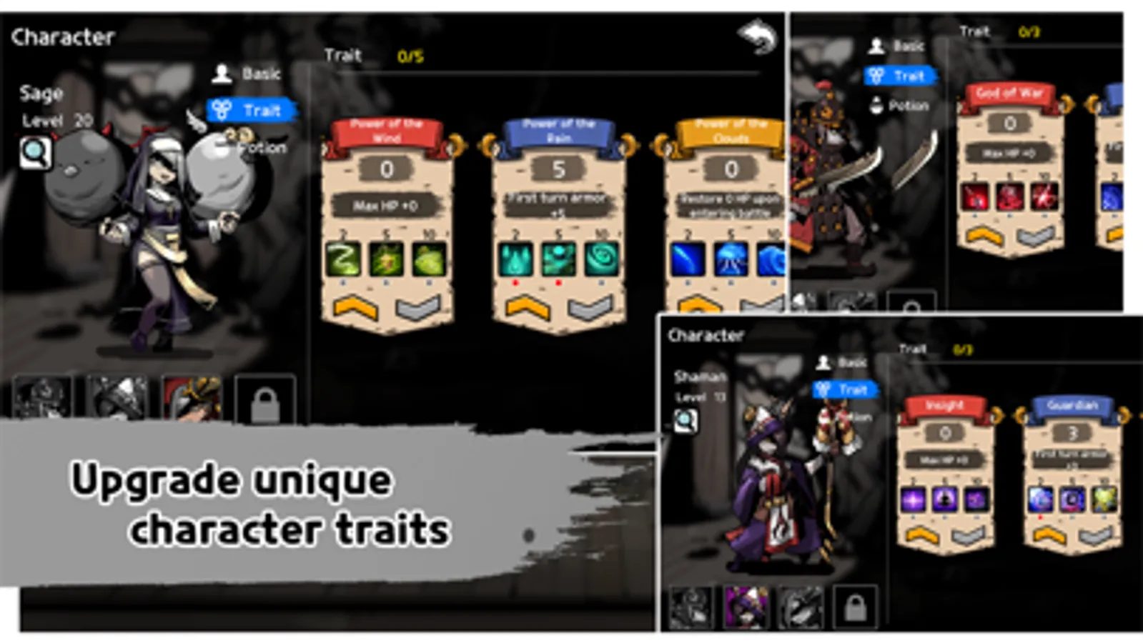 Each character has unique traits that can be upgraded with Trait Points.