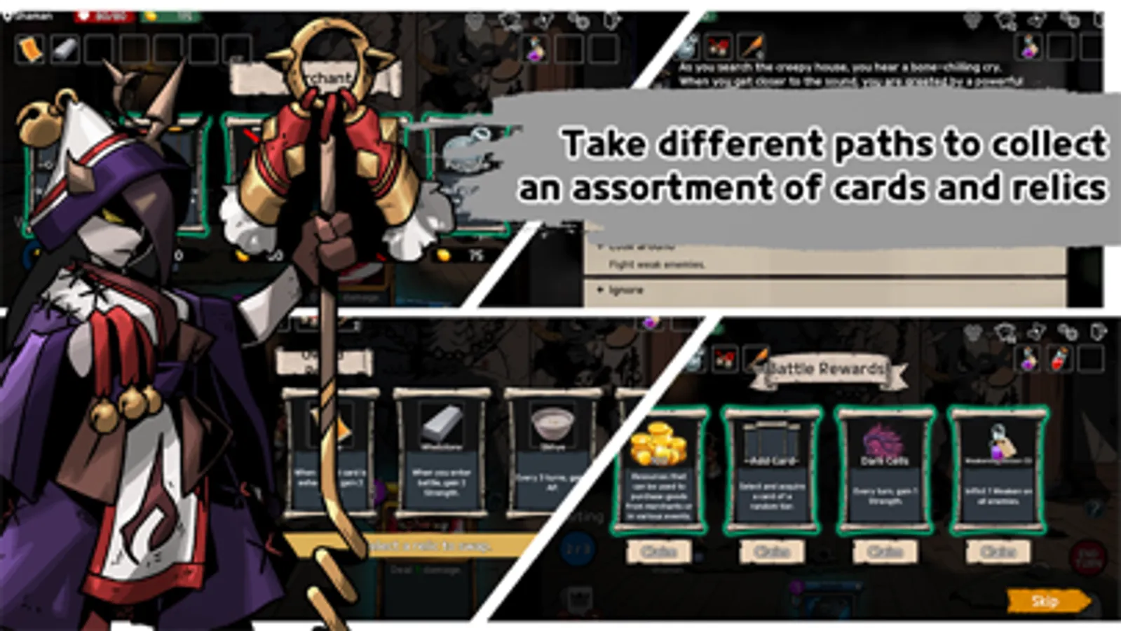 - Purchase cards and items from Merchants and restore HP and upgrade cards at Camps.