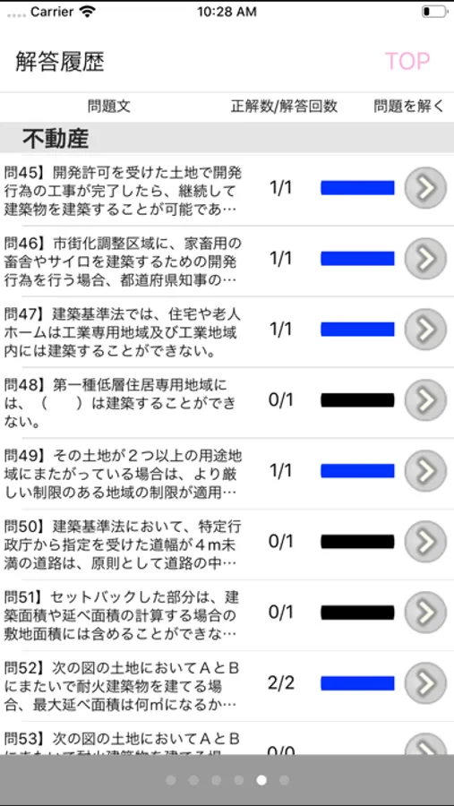 解答履歴では、正答率70%以上は青、40%以上は黄、それより低い場合は赤と色分け表示されるので、苦手な