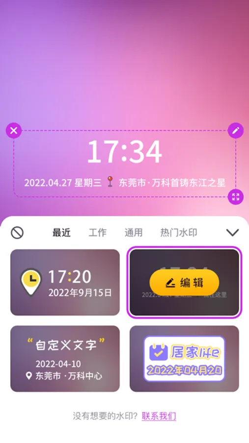 【水印丰富】app中含有多种水印模版供你选择,时间,地点,日期,美食,打卡,应有尽有