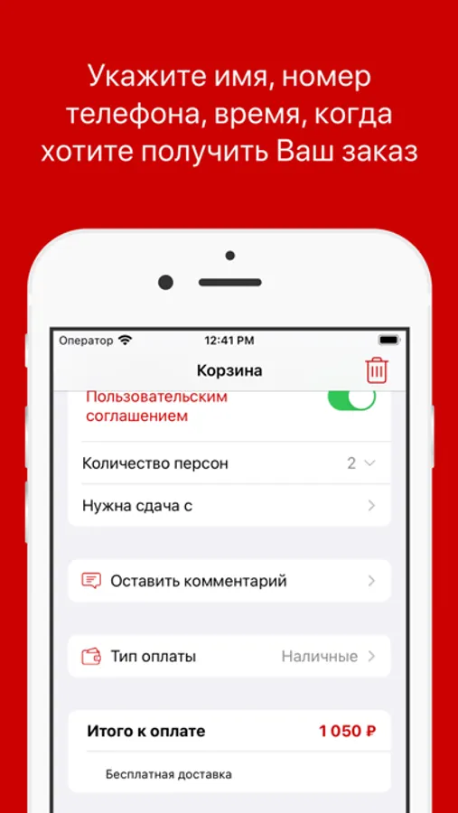 Укажите время, когда хотите прийти за своим заказом или выберите доставку с указанием времени и адреса доставки.