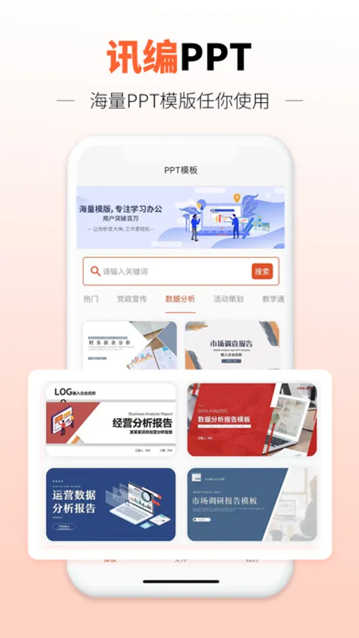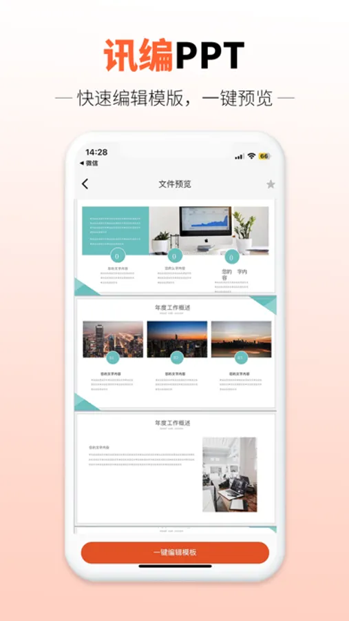 迅编PPT制作是一款移动办公服务一体化应用平台-集合PPT模板,PPT图表,PP图片,PPT制作教程于一体的办公学习类工具产品,帮助您随时随地发现您需要的办公资源文件,简化工作、提高效率。 我们的PPT模板可涵盖众多使用场景工作总结、求职应聘、商业计划书、企业宣传、结婚恋爱、毕业答辩等。