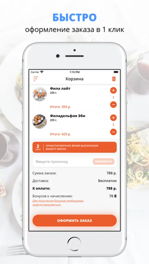 Скачивайте наше приложение, оформляйте заказ и наслаждайтесь любимой едой, где бы Вы ни были! Приятного аппетита!