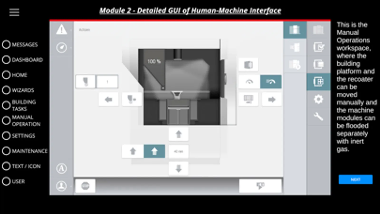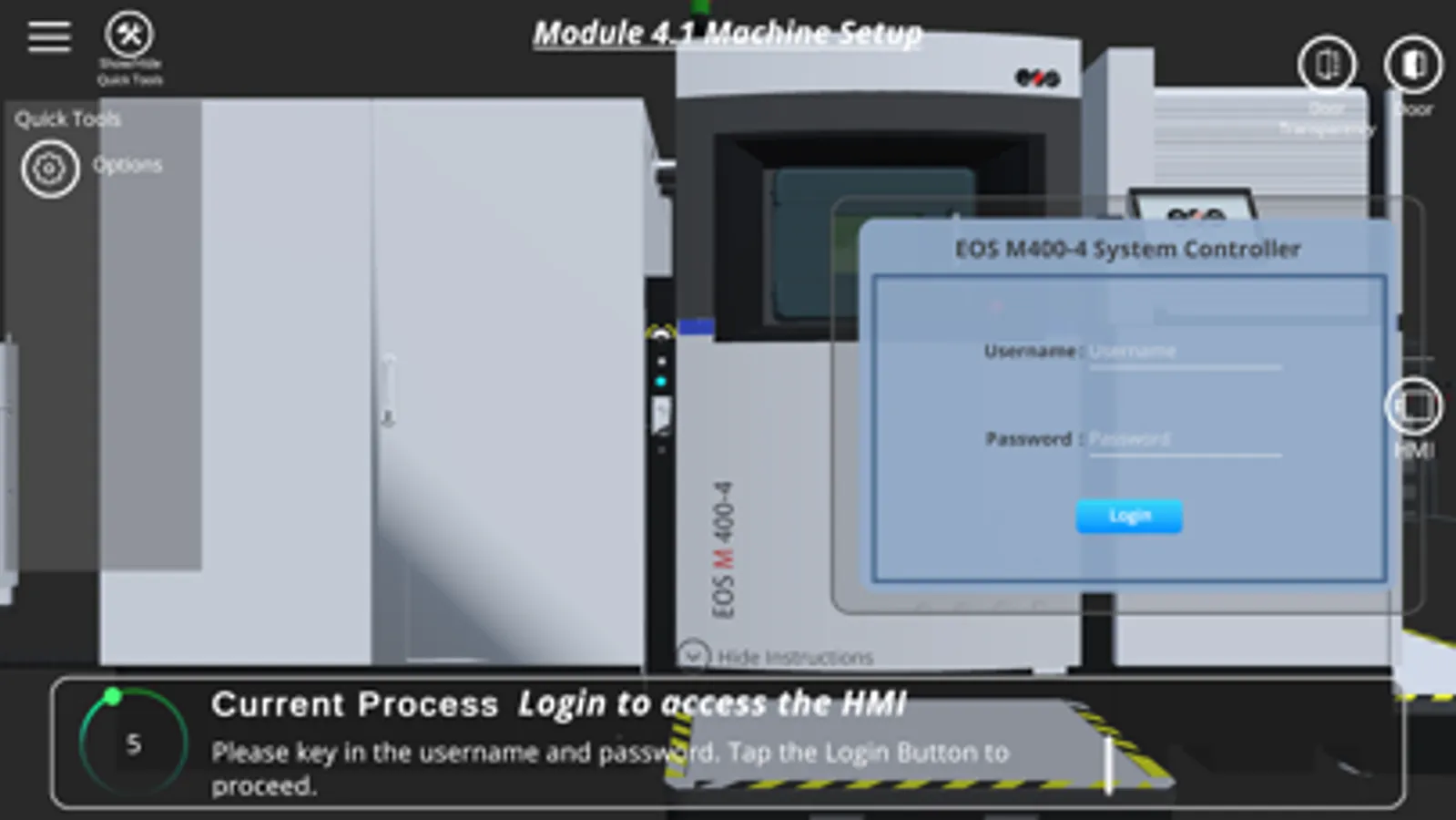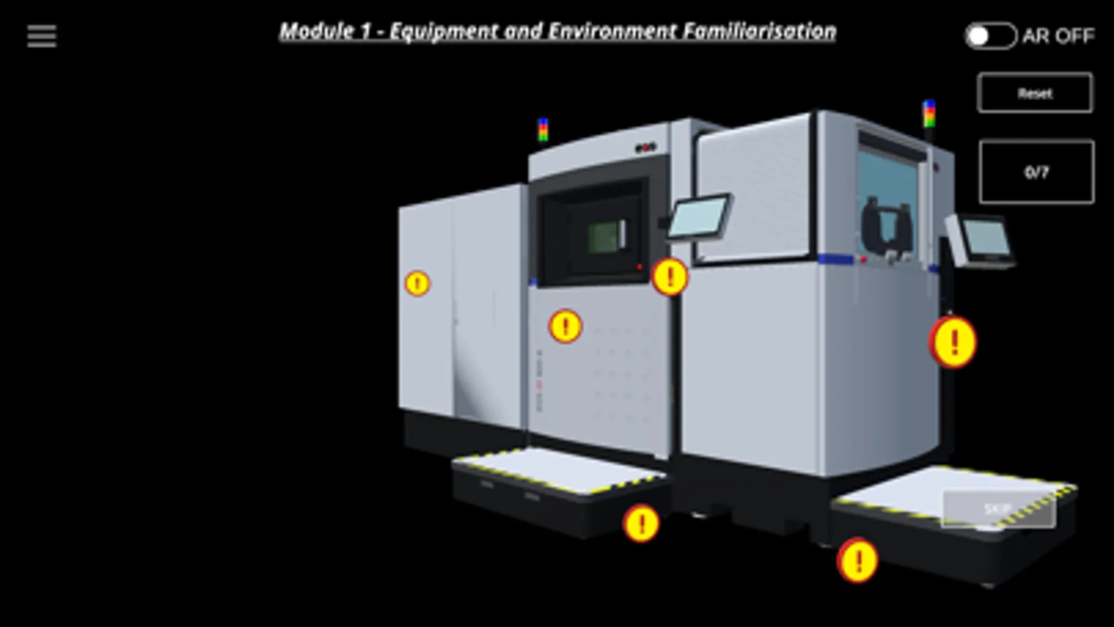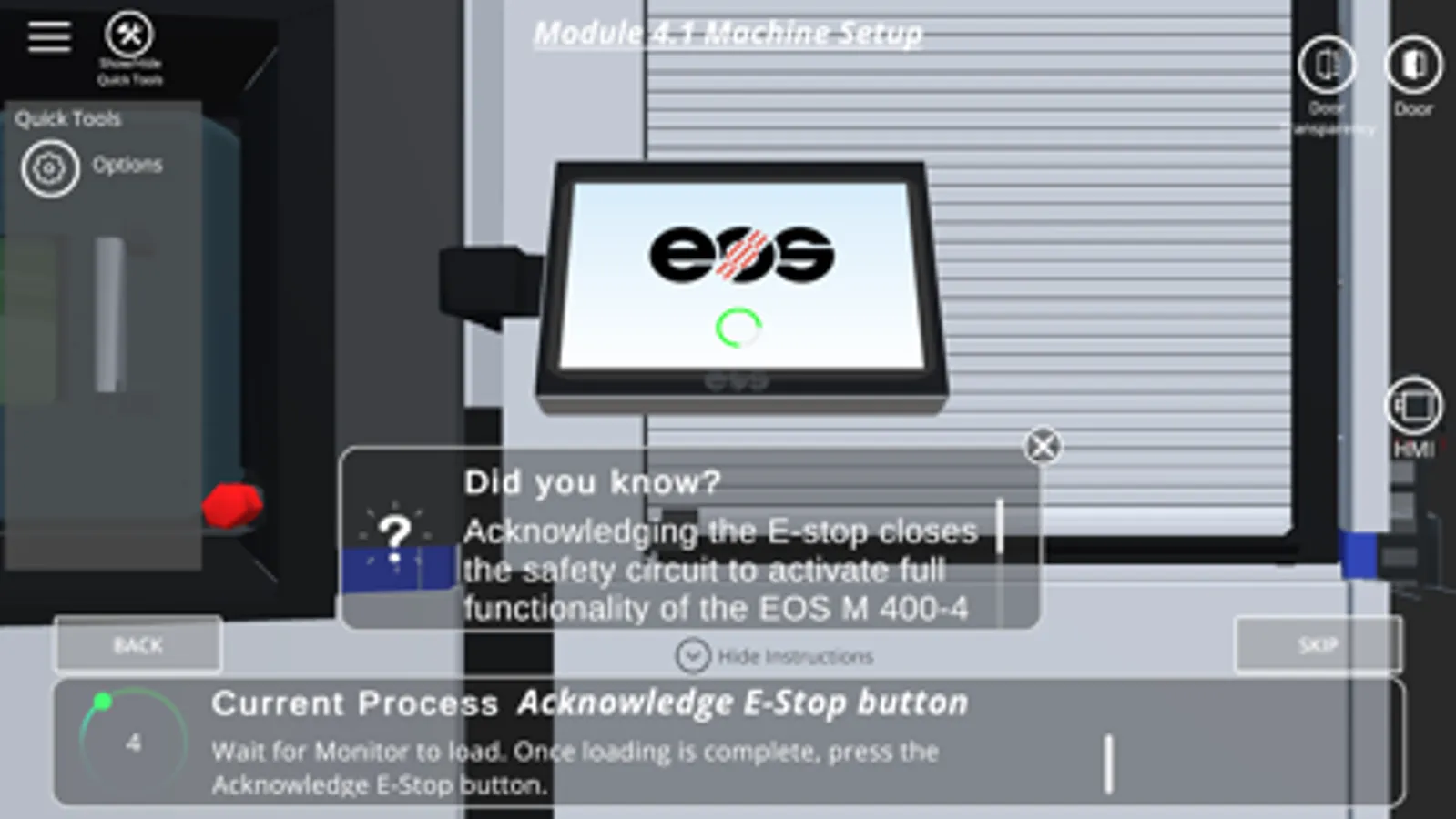 Module 1 takes you through an xR based machine familiarization where you will learn about the different components, features and functions of the EOS M 400-4 system. With the AR mode on, you will be able to physically navigate and explore a real-size virtual model of the system with visual cues, that will indicate the key regions of interest.