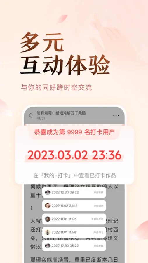打卡、评论等充满仪式感的互动功能,不仅能够让你与喜爱的作者互动,更能帮助你快速地找到你同频的知己。在这里你能够尽情与同好们分享自己的想法,并在良好的互动氛围中,获得更多的情绪价值。