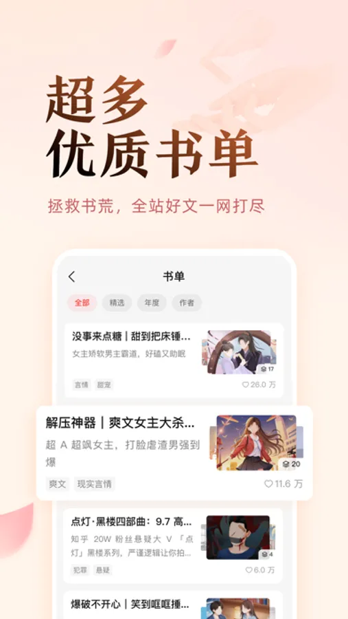 盐言故事为你提供多个精选书单,在这里,你能够一次性阅读多个喜爱的故事。找到一篇喜爱的好故事,你就能快速、便捷地找到更多喜爱的好故事,充分利用休闲时间,获得沉浸式的阅读体验。