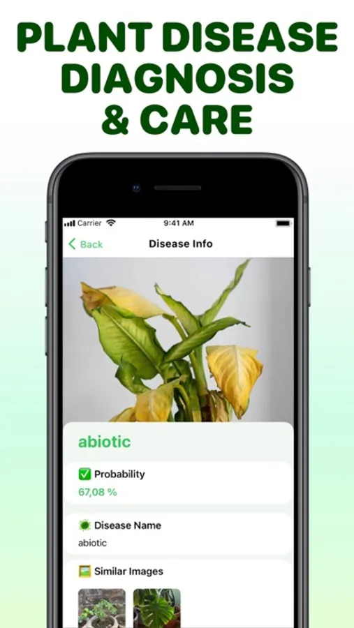 Take a photo or select photo from gallery to identify more than 100 different plant diseases, such as: pests, fungal disease, over-watered plant and more. We provide you information about the identified plant disease, such as: probability, common and disease name, classification, cause, similar images, description, treatment and more.