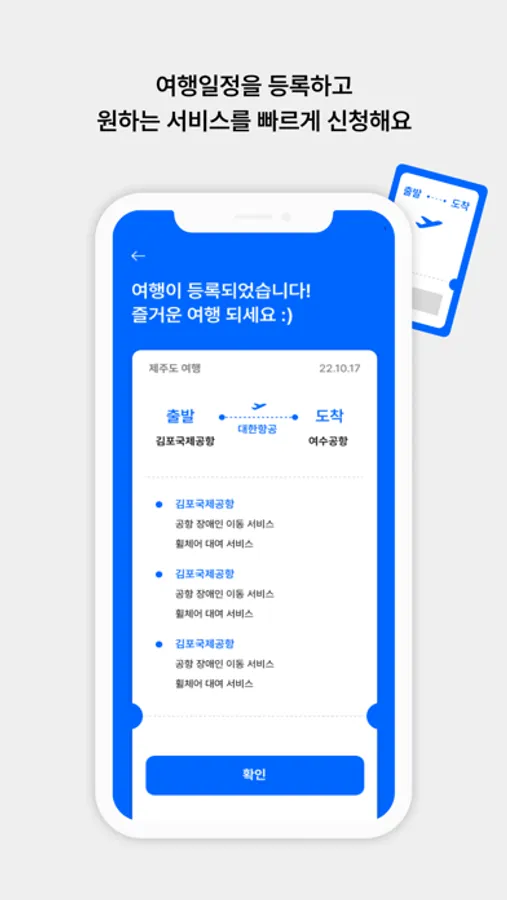 비행기를 타고 떠나는 일정과 공항, 항공사에서 이용할 교통약자 서비스를 기록해놓으세요.