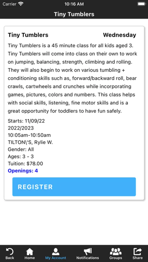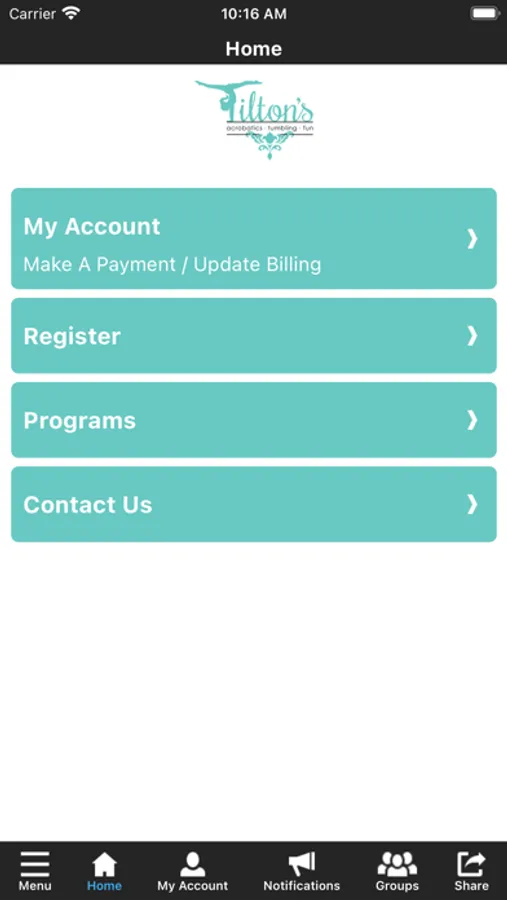 The Tilton's app allows you to manage your account with ease, check your balance, review your child's skills and levels. You'll also receive important notifications about class changes, closings, registration openings, special announcements, and upcoming events.