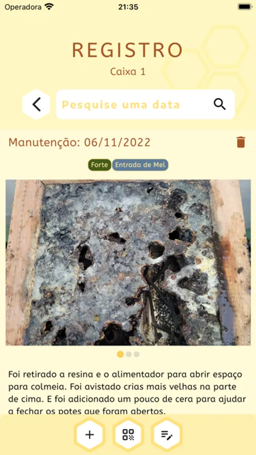 Com este aplicativo você pode manter o registro de todas as manutenções feitas em suas colmeias. Tudo na palma da sua mão!