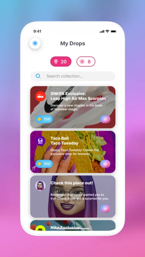 - Collect enough drops and you’ll unlock the feature that allows you to create drops of your own to send to all your favorite people. Leave them messages at your favorite beach, send them menu hacks at your favorite sandwich shop, or even gift them geo-located USD cash to be used at whatever store or restaurant you fancy.