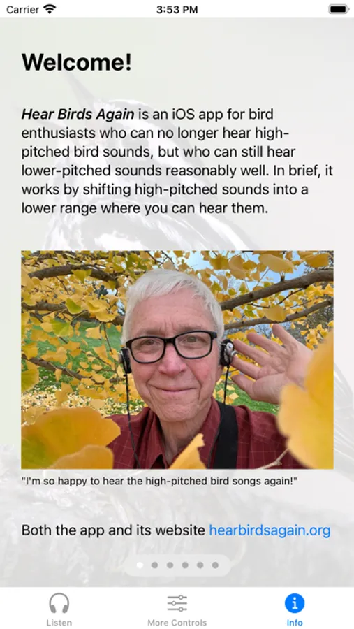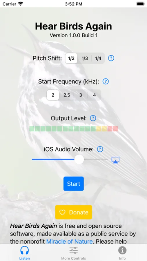 Hear Birds Again is a free, open-source iOS mobile application for bird enthusiasts who suffer from high frequency hearing loss and desire to once again enjoy the uplifting songs of wild birds. It works by using advanced algorithms to lower the pitch of bird songs in real time, thereby making them audible during walks in nature.