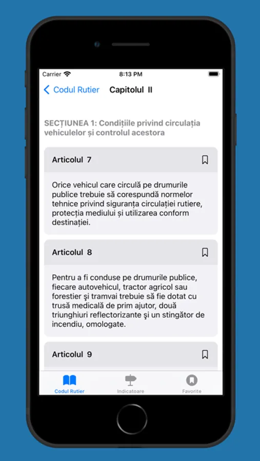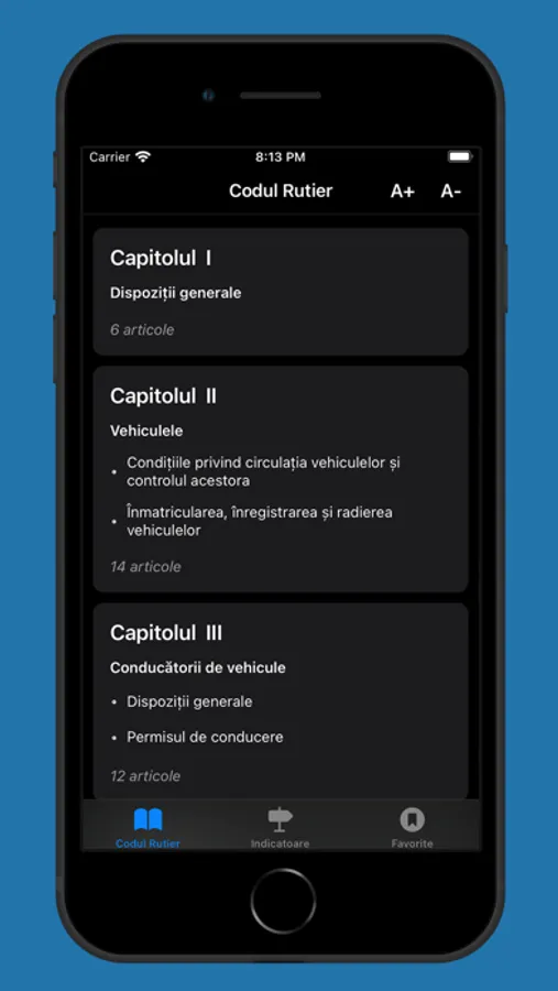 "Codul Rutier" contine toate articolele actualizate la zi, alaturi de indicatoarele rutiere cu explicatiile aferente.