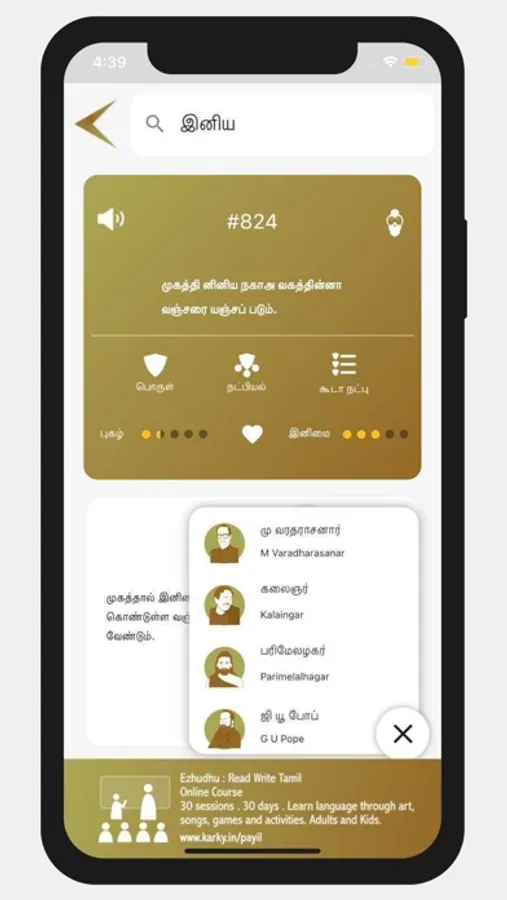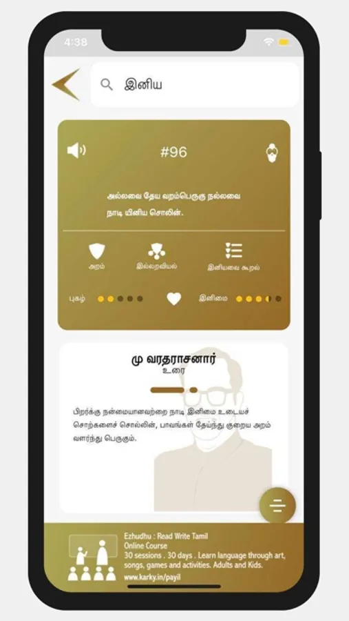 Kural App is the best app to browse Kurals. Kural app provides a rich set of features for you to explore Thiruvalluvar's timeless classic. You can search for concepts in Tamil or English. You can search for concepts instead of keywords. Audio is provided for all Kurals. Four different interpretations are available in the app for you to understand the verses from different view points.