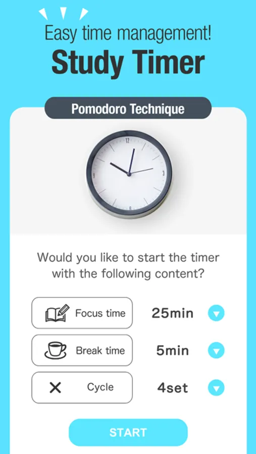 A typical set is 25 minutes of focus and 5 minutes of break, with a maximum of 4 sets. However, if you feel that 25 minutes is too long for your focus time, try adjusting your focus time to 15 minutes and your break time to 3 minutes.
