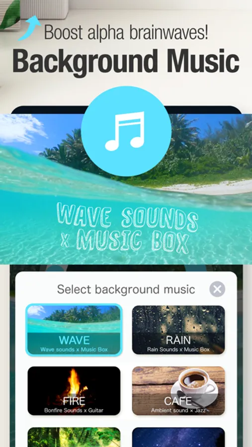 Five kinds of comfortable background music are available. Choose according to your taste and mood, draw out alpha waves, and show your concentration.