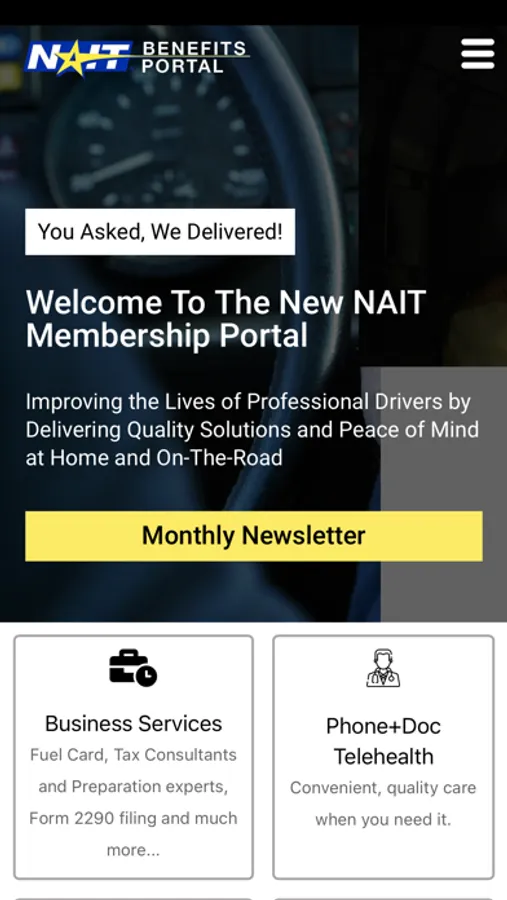 The NAIT benefits portal is your one source application to access amazing tools & benefits only NAIT could offer. From Telahealth to roadside assistance, have it all at your finger tips