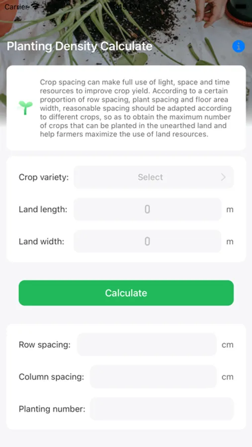 In order to make organic crops better synthesize organic substances, we developed this application to help calculate the spacing between crops and increase the yield.