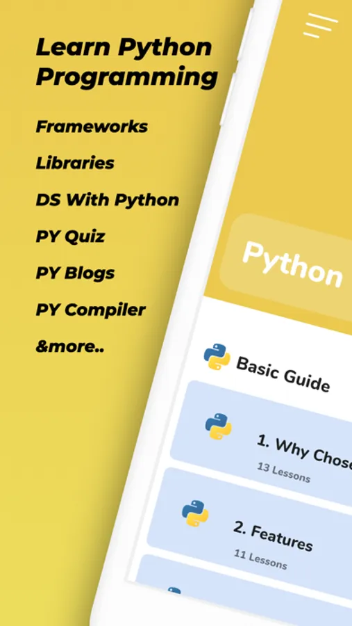 Python is a powerful general-purpose programming language. Our Python tutorial will guide you to learn Python one step at a time with the help of examples. This app gives enough understanding on Python programming language. This app will give you a full introduction into all of the core concepts in python.